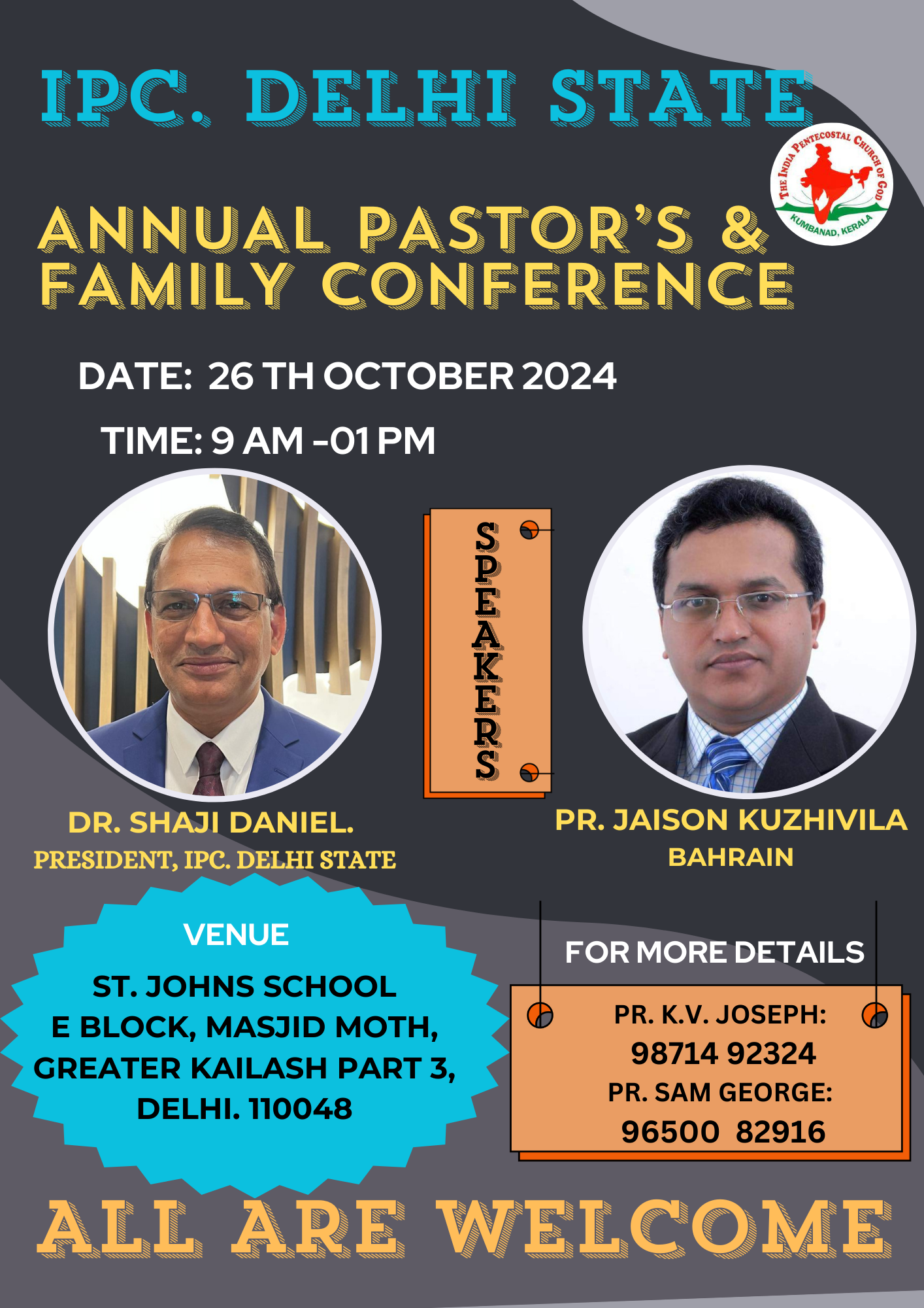 आईपीसी दिल्ली राज्य के सेवकों और परिवारों का वार्षिक सम्मेलन शनिवार 26 अक्टूबर 2024 को सुबह 9 बजे से दोपहर 1 बजे तक सेंट जॉन्स स्कूल ऑडिटोरियम, दिल्ली ग्रेटर कैलाश 3 में आयोजित किया जाएगा। प्रदेश अध्यक्ष डाॅ. शाजी डैनियल और पादरी। जेसन कुशिविला (बहरीन) मुख्य संदेश देंगे।