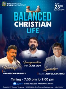 आईपीसी दिल्ली स्टेट ईस्ट डिस्ट्रिक्ट पी।वाई।पी।ए के तत्वावधान में शनिवार 23 जुलाई 2022 को शाम 7.30 बजे से रात 9 बजे तक जूम प्लेटफॉर्म के जरिए ऑनलाइन बैठक होगी। बैठक का विषय “संतुलित मसीही जीवन” है। बैठक का उद्घाटन पादरी जिजो जॉय करेंगे। डॉ। जोएल मथाई मुख्य भाषण देंगे। भाई। प्रैसन सन्नी आराधना का नेतृत्व करेंगे।
