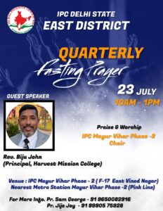 आईपीसी दिल्ली स्टेट ईस्ट डिस्ट्रिक्ट त्रिमासिक उपवास प्रार्थना शनिवार 23 जुलाई 2022 को सुबह 10 बजे से दोपहर 1 बजे तक आईपीसी मयूर विहार फेज 2 चर्च हॉल में होगी। पादरी। बीजू जॉन (प्रधानाचार्य, हार्वेस्ट मिशन कॉलेज) मुख्य भाषण देंगे। आईपीसी मयूर विहार फेज 2 कोयर आराधना का नेतृत्व करेंगे।
