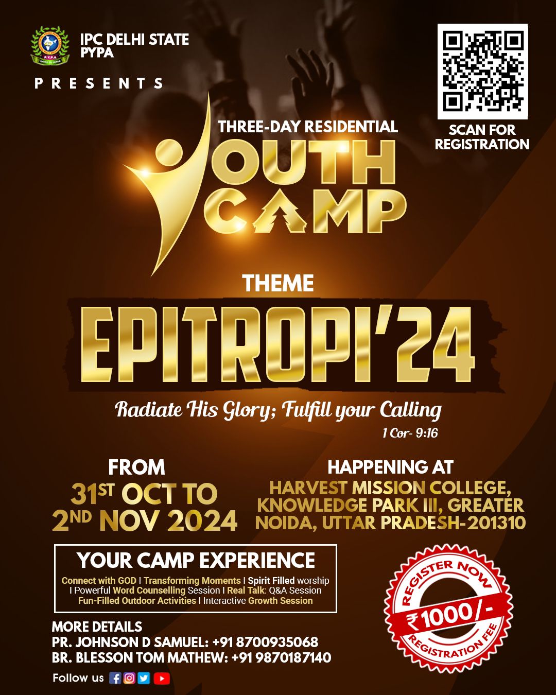 ഐപിസി ഡൽഹി സ്റ്റേറ്റ് PYPA യുടെ ആഭിമുഖ്യത്തിൽ 2024 ഒക്ടോബർ 31 മുതൽ നവംബർ 2 വരെ ത്രിദിന യുവജന ക്യാമ്പ് ഗ്രേറ്റർ നോയിഡ യിലുള്ള ഹാർവെസ്റ്റ് മിഷൻ കോളേജ് ക്യാമ്പസിൽ വച്ച് നടത്തപ്പെടുന്നതാണ്.