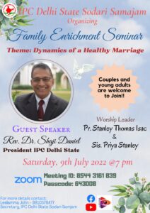 ഐപിസി ഡൽഹി സ്റ്റേറ്റ് സോദരി സമാജത്തിന്റെ ആഭിമുഖ്യത്തിൽ 2022 ജൂലൈ 9 ശനിയാഴ്ച വൈകിട്ട് 7 മണി മുതൽ കുടുംബ സമ്പുഷ്‌ടീകരണ സെമിനാർ സൂം പ്ലാറ്റ് ഫോമിൽ നടത്തപ്പെടും. സ്റ്റേറ്റ് പ്രസിഡന്റ് പാസ്റ്റർ. ഷാജി ദാനിയേൽ ക്ലാസ്സ്‌ നയിക്കും. Dynamics of a healthy Marriage (ആരോഗ്യകരമായ ദാമ്പത്യത്തിന്റെ ചലനാത്മകത) എന്നതാണ് ചിന്താവിഷയം. പാസ്റ്റർ. സ്റ്റാൻലി ഐസക് & ടീം ആരാധനക്ക് നേതൃത്വം നൽകും. സൂം ഐഡി : 8544- 3161- 839.