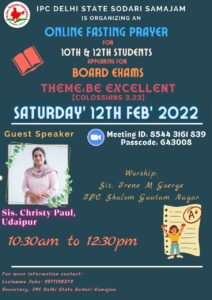 आईपीसी दिल्ली स्टेट सिस्टर्स सोसाइटी द्वारा आयोजित एक दिवसीय उपवास प्रार्थना शनिवार 12 फरवरी 2022 को सुबह 10.30 बजे से दोपहर 12.30 बजे तक जूम प्लेटफॉर्म के माध्यम से होगी। यह 10वीं और 12वीं के उन बच्चों के लिए विशेष प्रार्थना की व्यवस्था है जो इस साल बोर्ड परीक्षा दे रहे हैं। “उत्कृष्ट रहो” प्रार्थना का विषय है। बहन। क्रिस्टी पॉल (उदयपुर) मुख्य भाषण देंगे।