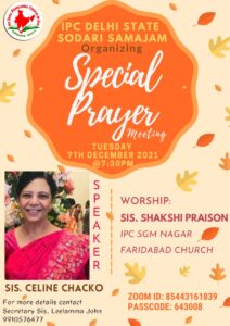 ഐപിസി ഡൽഹി സ്റ്റേറ്റ് സോദരി സമാജം ഒരുക്കുന്ന സ്പെഷ്യൽ ഓൺലൈൻ മീറ്റിംഗ് 2021 ഡിസംബർ 7 ന് വൈകിട്ട് 7.30 മുതൽ സൂം പ്ലാറ്റ് ഫോമിൽ നടത്തപ്പെടും. സിസ്റ്റർ. സെലിൻ ചാക്കോ മുഖ്യ സന്ദേശം നൽകും. സിസ്റ്റർ. സാക്ഷി പ്രയ്സൺ ( ഐപിസി സഞ്ജയ് നഗർ, ഫാരിദാബാദ് ) ആരാധനക്ക് നേതൃത്വം നൽകും.