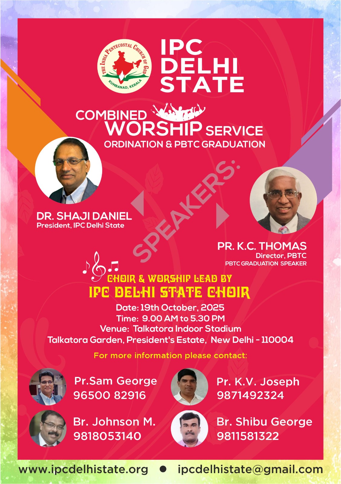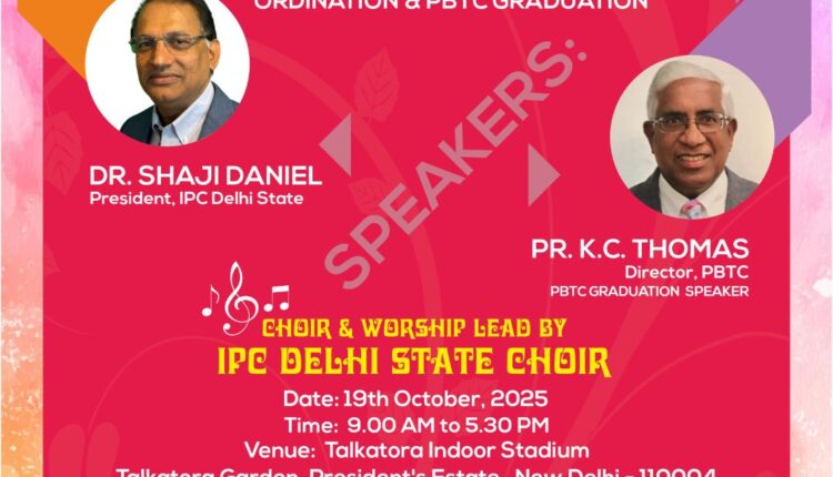 ഐപിസി ഡൽഹി സ്റ്റേറ്റ് ലെ സഭകളുടെ സംയുക്ത ആരാധനയും ശുശ്രൂഷകന്മാരുടെ ഓർഡിനേഷനും 2025 ഒക്ടോബർ 19 ന് ഡൽഹിയിലുള്ള Talkatora Indoor സ്റ്റേഡിയത്തിൽ വച്ച് അനുഗ്രഹീതമായി നടത്തപ്പെട്ടു.