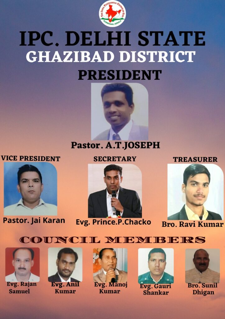 ഐ.പി.സി. ഡൽഹി സ്റ്റേറ്റ് ഗസിയാബാദ് ഡിസ്ട്രിക്ട് 2021-2022 പ്രവർത്തന വർഷത്തേക്ക് പുതിയ പ്രവർത്തക സമിതിയെ തിരഞ്ഞെടുത്തു.പ്രസിഡന്റ്: ഡിസ്ട്രിക്ട് പാസ്റ്റർ. A.T. ജോസഫ് (ഐപിസി കർമേൽ ഗാസിയാബാദ്), വൈസ് പ്രസിഡന്റ്: പാസ്റ്റർ. ജയ് കരൺ (ഐ.പി.സി. മോദി നഗർ), സെക്രട്ടറി: ഇവഞ്ചലിസ്റ്റ്. പ്രിൻസ്. പി. ചാക്കോ(ഐ.പി.സി. മൻഡാവലി)