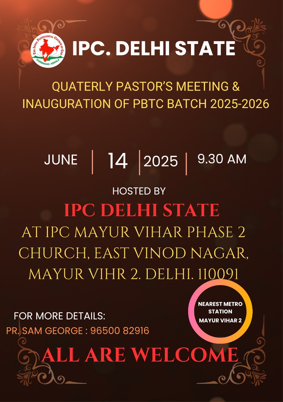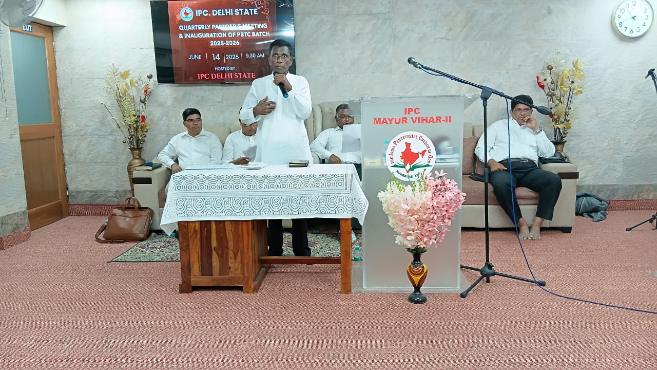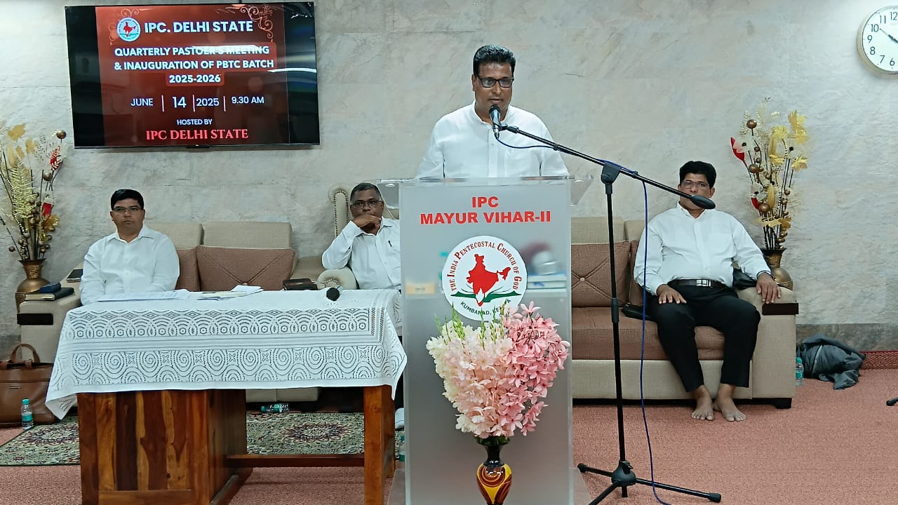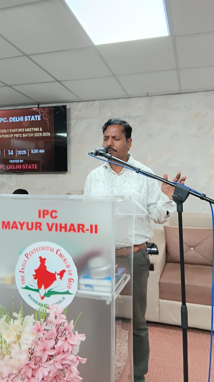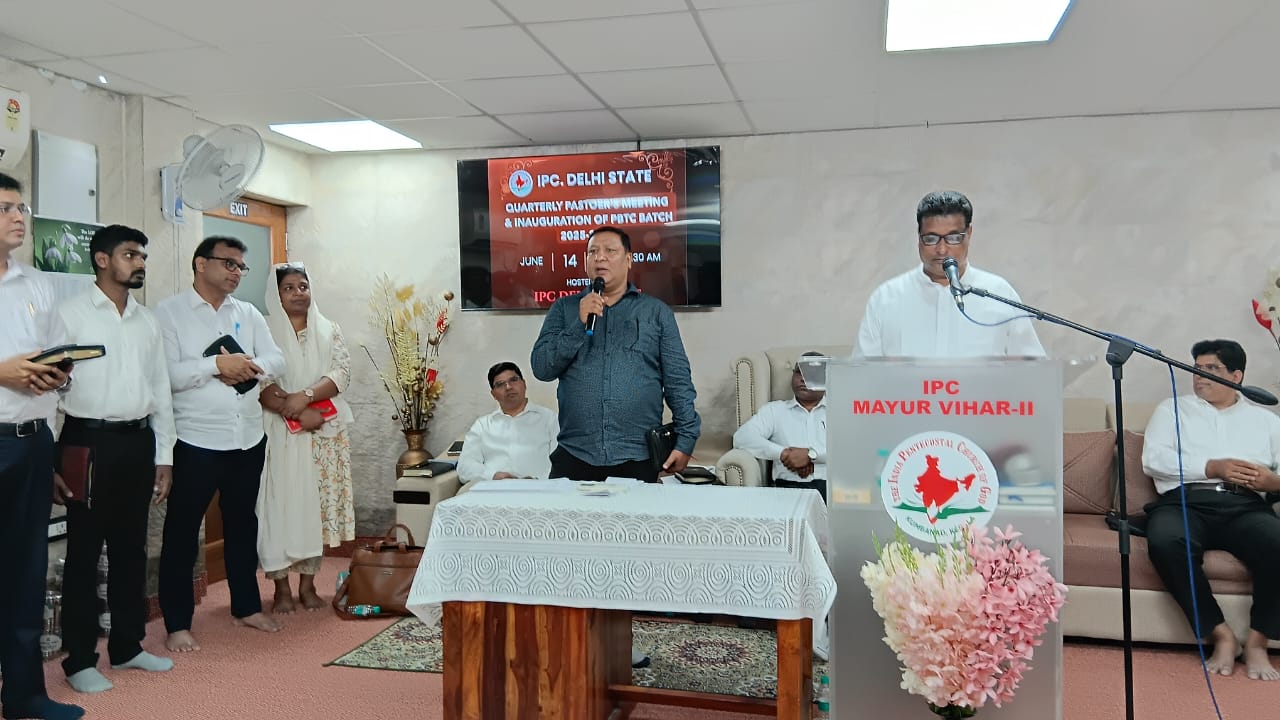 आईपीसी दिल्ली राज्य त्रैमासिक पादरियों की बैठक और पेनियल बाइबल प्रशिक्षण केंद्र 2025-2026 शैक्षणिक वर्ष का उद्घाटन 14 जून 2025 को सुबह 9.30 बजे आईपीसी मयूर विहार फेज 2 चर्च में हुआ। आईपीसी दिल्ली उत्तर जिला अध्यक्ष पादरी सी. जॉन ने बैठक में अध्यक्षता की। पादरी ए. के. रेजी (पश्चिम जिला अध्यक्ष) ने भजन पढ़ा और उपदेश दिया। पादरी सैम करुवत्ता ने धन्य आराधना का नेतृत्व किया। पादरी टी. के. सैम, संतोष टी. सी., जोसेफ जॉय और दीपक एडवर्ड ने प्रार्थना की।