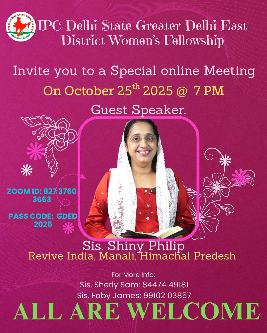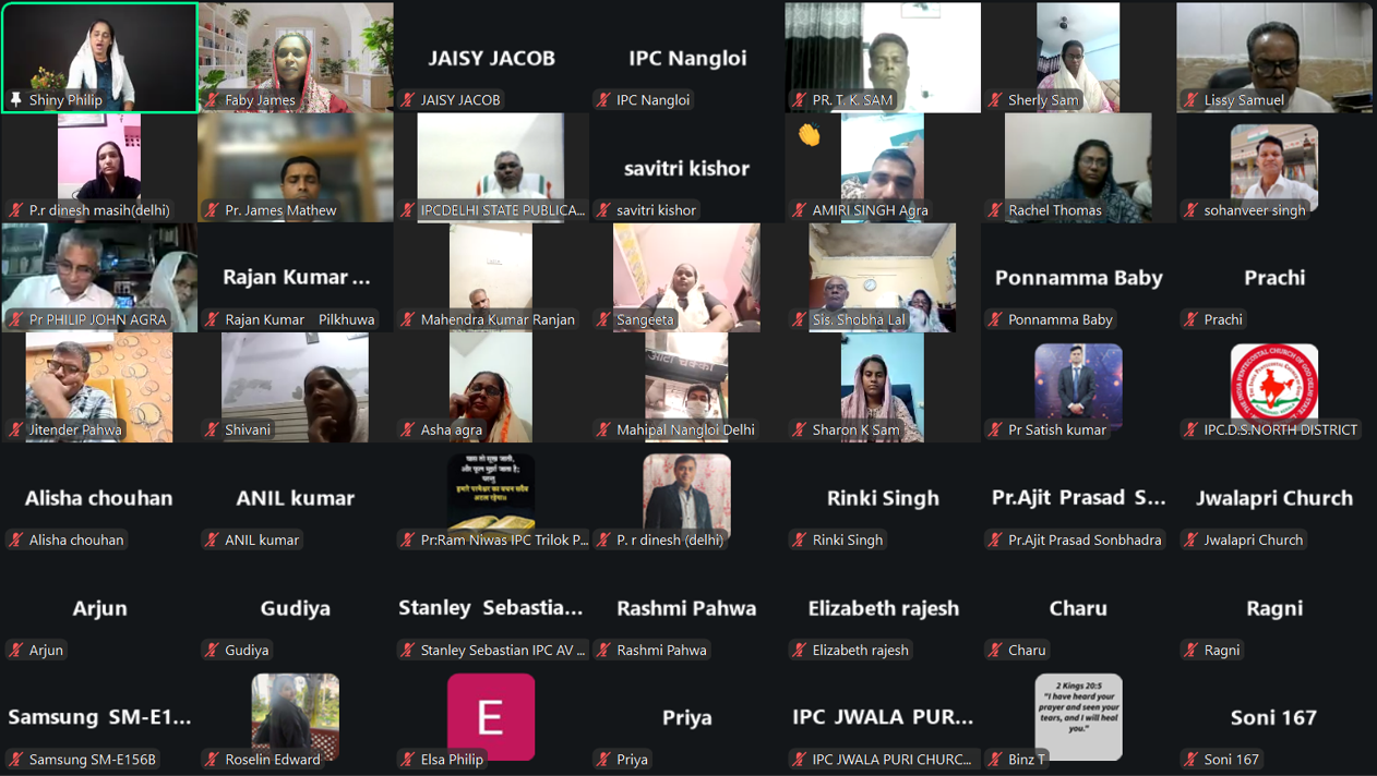 ഐപിസി ഡൽഹി സ്റ്റേറ്റ് ഗ്രേറ്റർ ഡൽഹി ഈസ്റ്റ്‌ ഡിസ്ട്രിക്റ്റ് വുമൺസ് ഫെല്ലോഷിപ് ന്റെ നേതൃത്വത്തിൽ 2025 ഒക്ടോബർ 25 ശനിയാഴ്ച വൈകിട്ട് 7 മണി മുതൽ 8.30 വരെ zoom പ്ലാറ്റുഫോമിൽ ഓൺലൈൻ മീറ്റിംഗ് നടത്തപ്പെട്ടു.