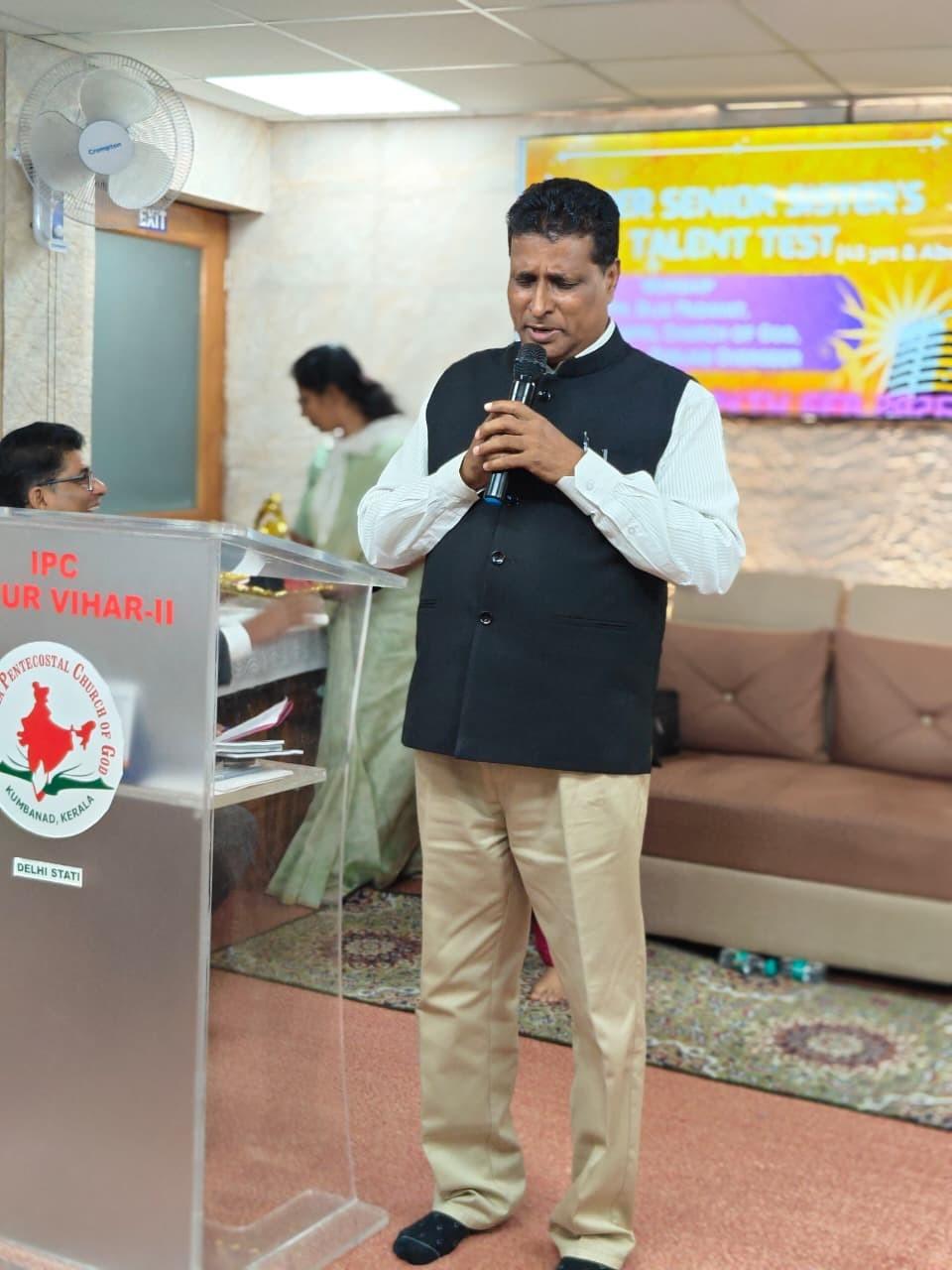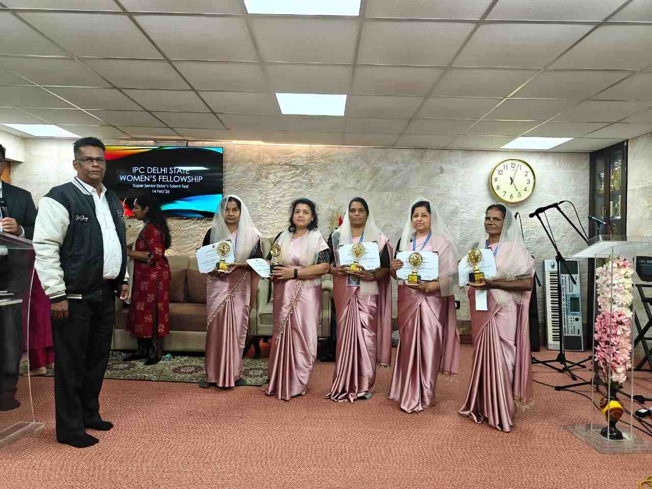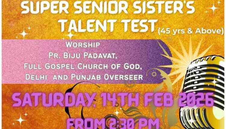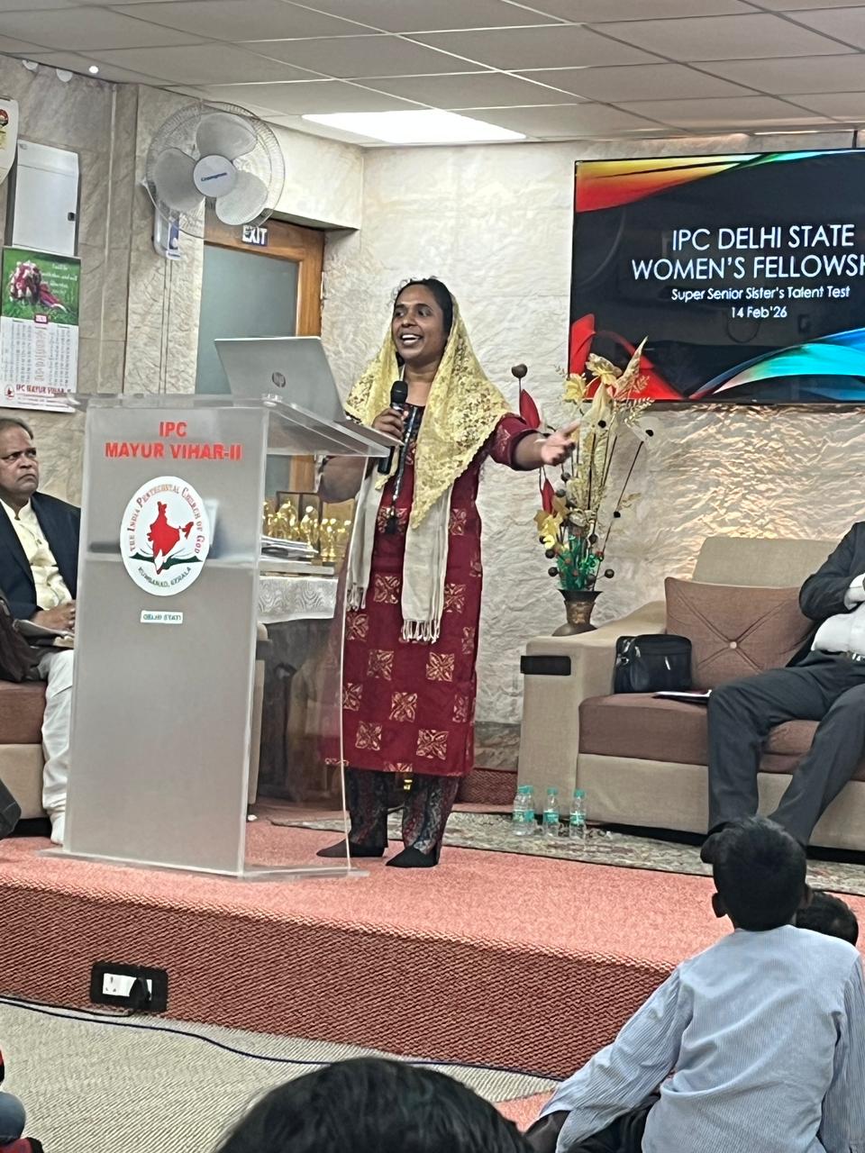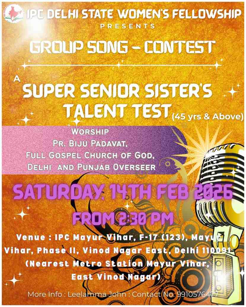 IPC Delhi State Women’s Fellowship ന്റെ നേതൃത്വത്തില് 2026 ഫെബ്രുവരി 14-ന് 2.30 pm മുതല് IPC Mayur Vihar Phase II സഭയില് വച്ച് “സൂപ്പർ സീനിയർ സിസ്റ്റേഴ്സ് ടാലന്റ് ടെസ്റ്റ് – ഗ്രൂപ്പ് സോംഗ്” വിജയകരമായി സംഘടിപ്പിച്ചു. സൗത്ത് ഡിസ്ട്രിക്ട് വൈസ് പ്രസിഡന്റായ പാസ്റ്റര്. സാം തോമസ് അധ്യക്ഷത വഹിച്ചു. അധ്യക്ഷന്റെ പ്രാർത്ഥനയോടെ യോഗം ആരംഭിച്ചു. പാസ്റ്റര് . ബിജു പടവത്ത് ആത്മനിറവിലുള്ള ആരധന നയിച്ചു.