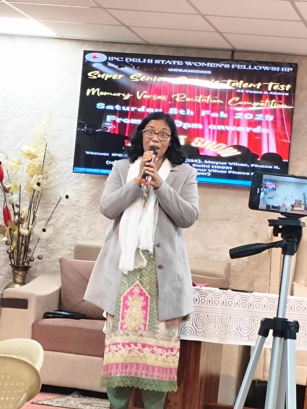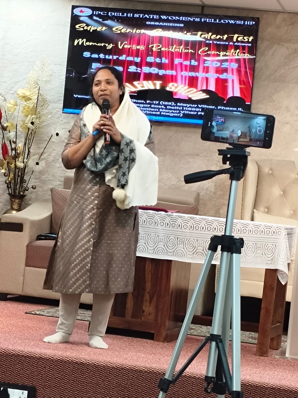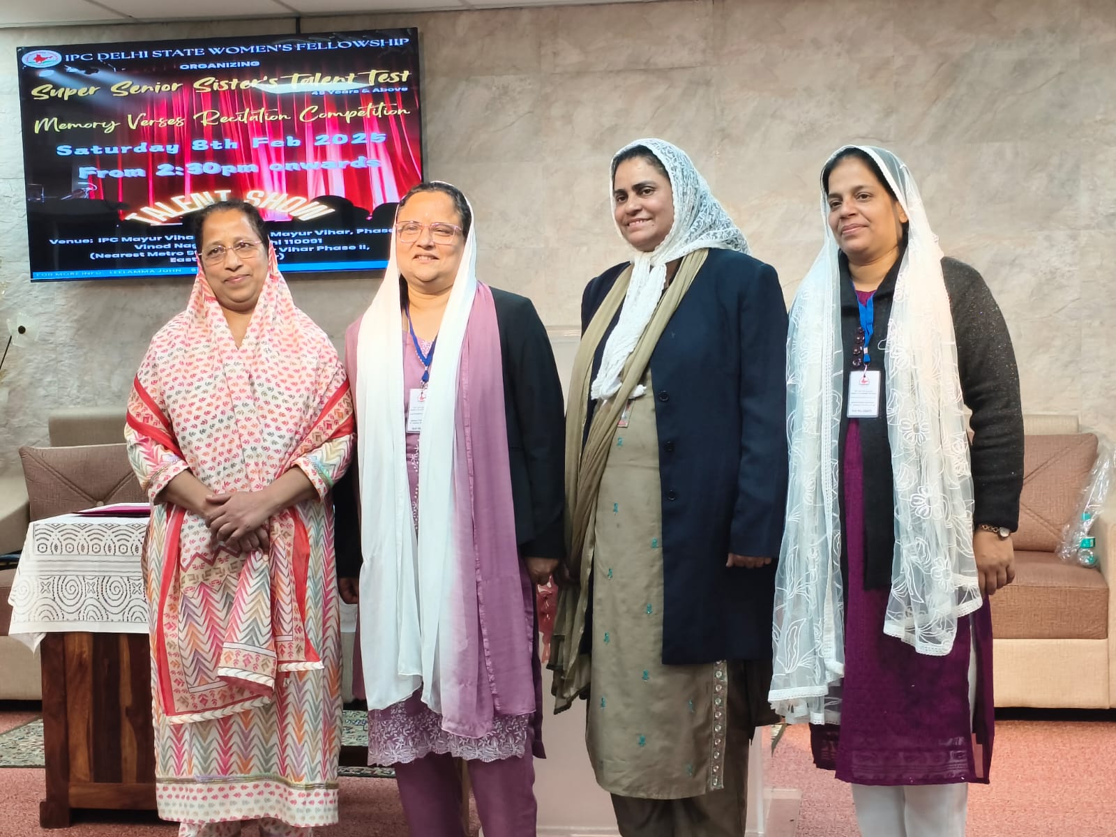 ഐപിസി ഡൽഹി സ്റ്റേറ്റ് വനിതാ ഫെലോഷിപ്പ് (IPCDSWF) 8/2/2025 ന് ഉച്ചയ്ക്ക് 2.30 മുതൽ ഐപിസി ഡൽഹി സ്റ്റേറ്റ് സെക്രട്ടറി പാസ്റ്റർ. സാം ജോർജിന്റെ അധ്യക്ഷതയിൽ 45 വയസ്സിനു മുകളിൽ പ്രായമുള്ള സഹോദരിമാർക്ക് വേണ്ടി സൂപ്പർ സീനിയർ സിസ്റ്റേഴ്സ് ടാലന്റ് ടെസ്റ്റ് “മെമ്മറി വേഴ്സസ് മത്സരം” സംഘടിപ്പിച്ചു. ഐപിസി ഡൽഹിസ്റ്റേറ്റ് വുമൺസ് ഫെലോഷിപ് ജോയിന്റ് സെക്രട്ടറി സിസ്റ്റർ ഫെബി. കെ. ബേബി ആരാധനയ്ക്ക് നേതൃത്വം നൽകി.