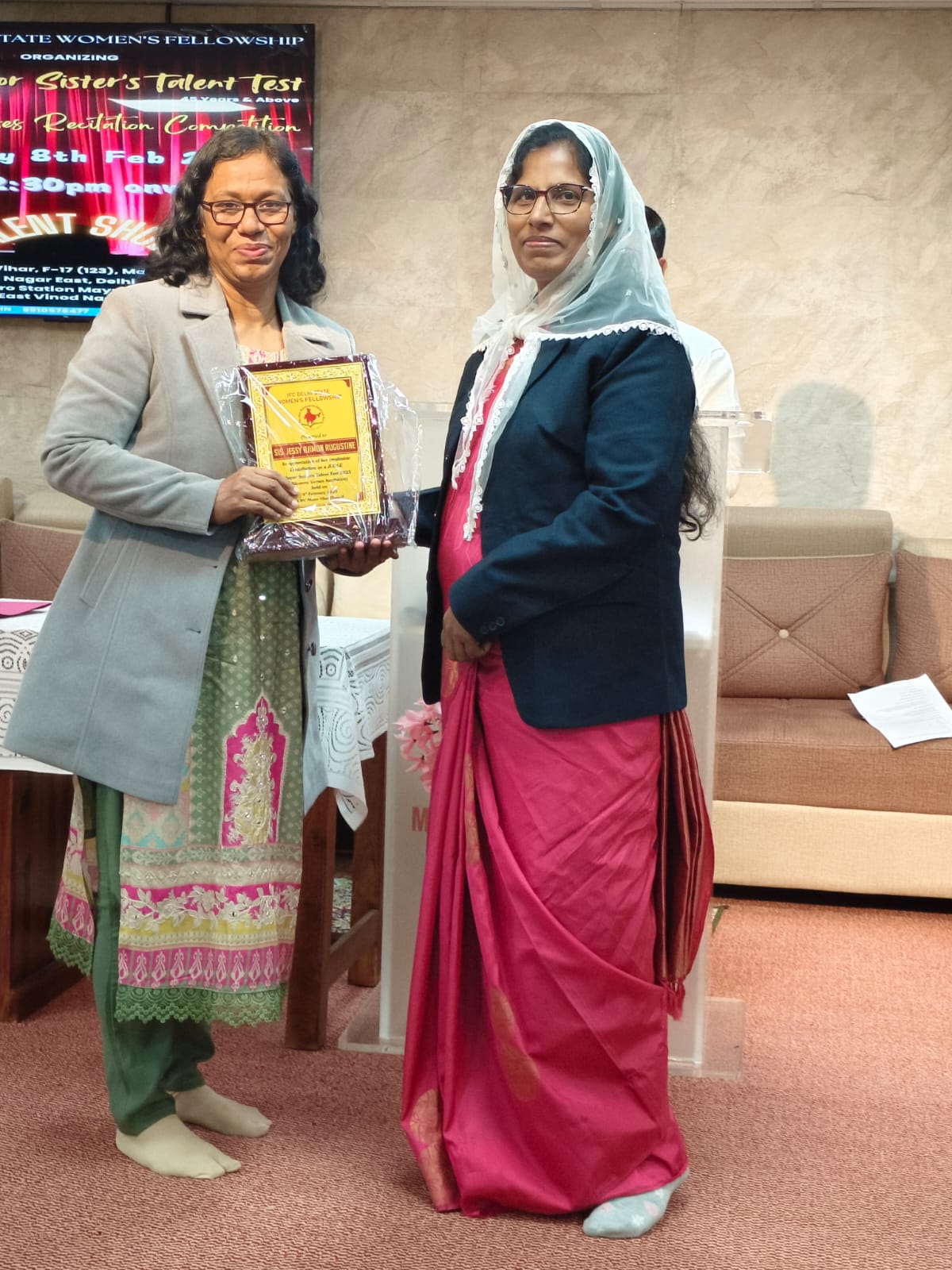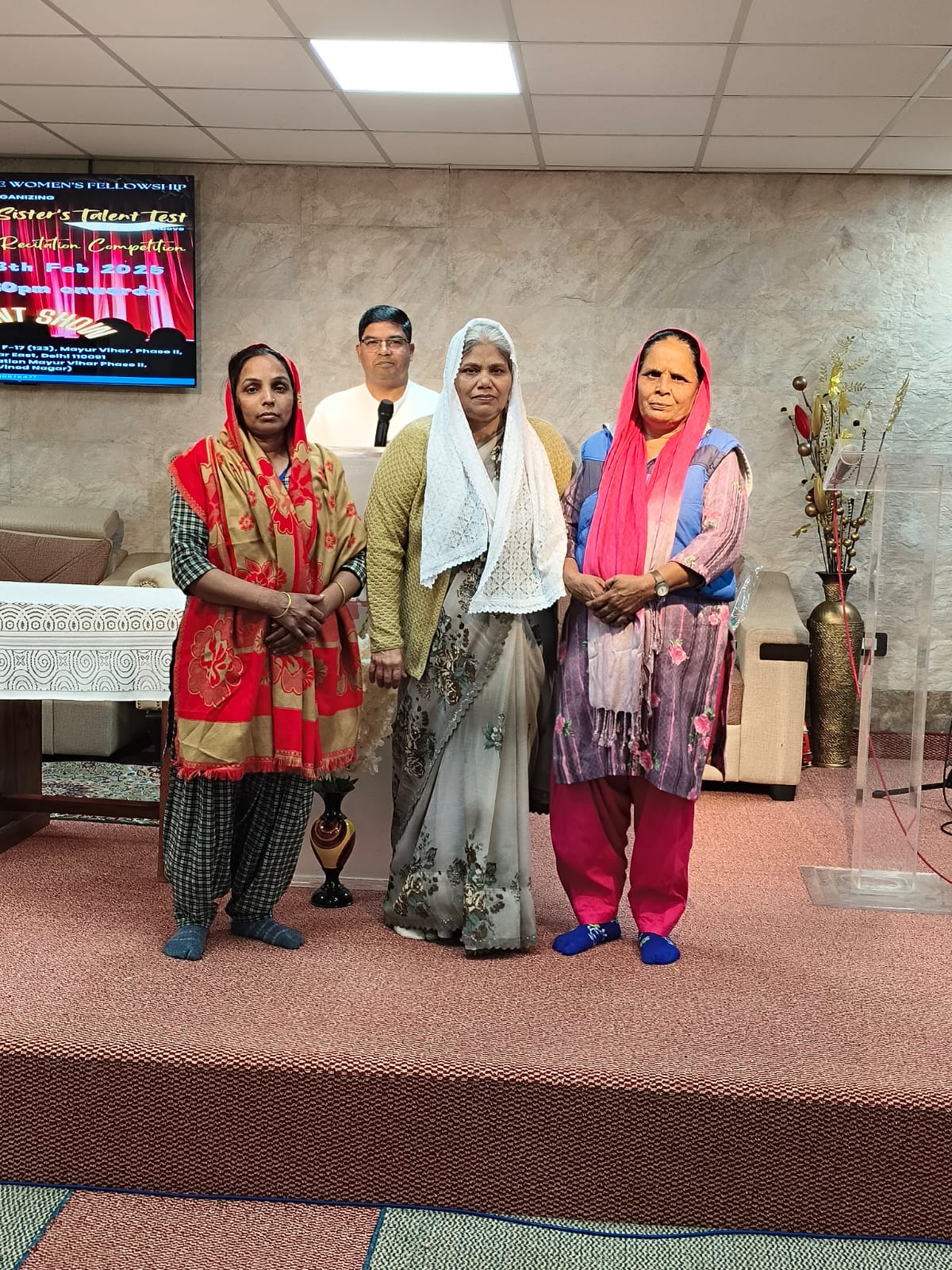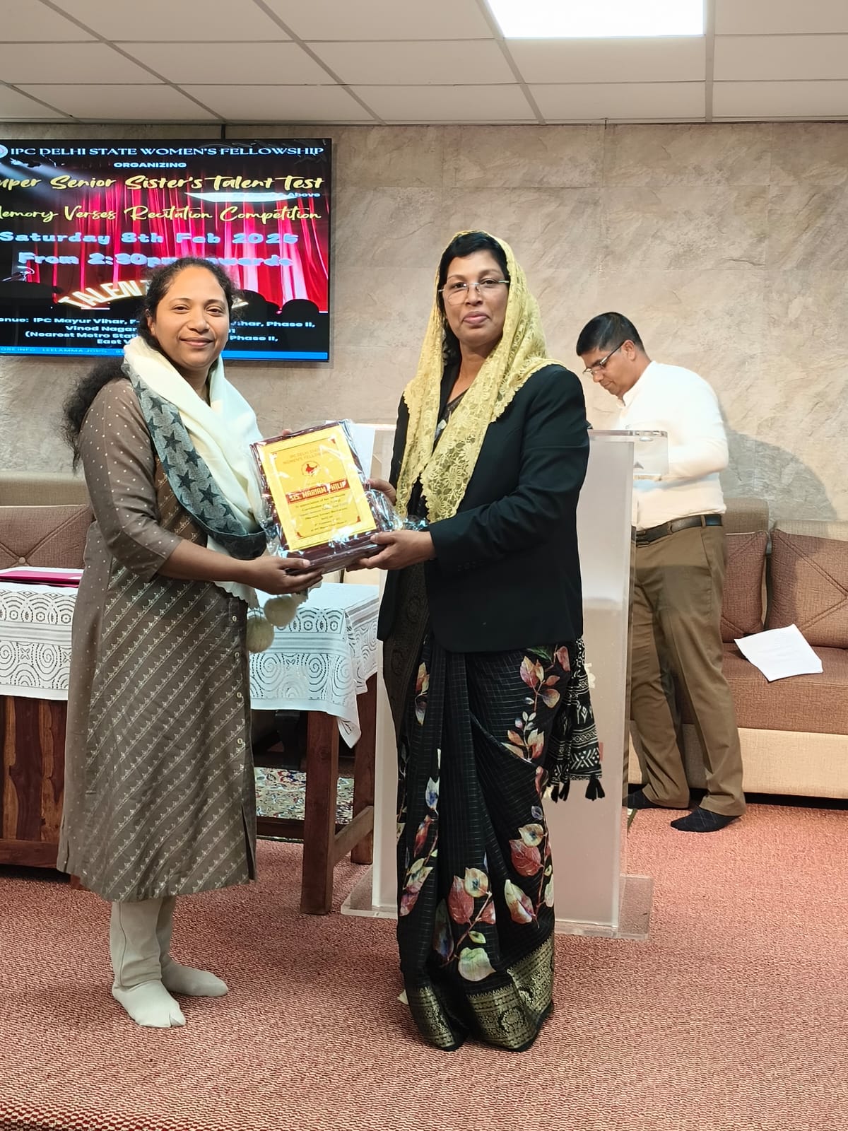 सुपर सीनियर सिस्टर्स टैलेंट टेस्ट “मेमोरी वर्सेज कॉम्पिटिशन” का आयोजन किया। सिस्टर फैबी के. बेबी, संयुक्त सचिव, डीएसडब्ल्यूएफ और पीबीटीसी की छात्राएं – ने आराधना का नेतृत्व किया। टैलेंट टेस्ट के जज थे भाई साजी के फिलिप(लव इन एक्शन एशिया के अध्यक्ष), सिस्टर मरियम फिलिप, (सोलिडारिडाड एशिया) और सिस्टर जेसी अजीमोन ऑगस्टीन, (ग्रेस गॉस्पेल मिनिस्ट्री)। पास्टर।के. वी. जोसेफ,( उपाध्यक्ष), पास्टर ।सैम जॉर्ज, (सचिव, आईपीसी दिल्ली स्टेट), पास्टर टी.सी. संतोष, (निदेशक, आईपीसी दिल्ली स्टेट संडे स्कूल एसोसिएशन ) ने शुभकामनाएं दीं और इस तरह के आयोजन के लिए दिल्ली स्टेट वूमेन फेलोशिप के कार्यकारी और परिषद सदस्यों की सराहना की। प्रतियोगिता देखने के लिए हर कोई उत्साहित था। और आईपीसी दिल्ली स्टेट डिस्ट्रिक्ट्स की बहनों ने प्रतियोगिता में भाग लिया। विशेष रूप से हिंदी चर्च की बहनों द्वारा बाइबल की आयतें पढ़ना बहुत ही सराहनीय था। स्मृति छंद प्रतियोगिता का परिणाम इस प्रकार है: