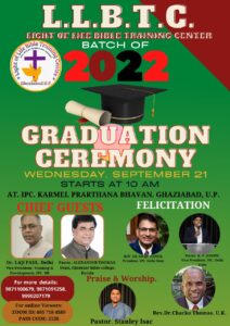 ഐപിസി ഗാസിയബാദ് ഡിസ്ട്രിക്ട് ന്റെ ആഭിമുഖ്യത്തിൽ നടത്തുന്ന ലൈറ്റ് ഓഫ് ലൈഫ് ബൈബിൾ ട്രെയിനിംഗ് സെന്റർ ന്റെ രണ്ടാമത്തെ ബാച്ചിന്റെ ഗ്രാജുവേഷൻ 2022 സെപ്റ്റംബർ 21 (ബുധനാഴ്ച) പകൽ 10 മണി മുതൽ ഐപിസി കർമേൽ ഗാസിയാബാദിൽ വച്ച് ബൈബിൾ സ്കൂൾ പ്രിൻസിപ്പൽ പാസ്റ്റർ സി ജോണിന്റെ അധ്യക്ഷതയിൽ നടത്തപ്പെടും. 2021 ൽ ലോക് ഡൌൺ കാലത്ത് ആരംഭിച്ച വേദപഠനം ഒരു ഓൺലൈൻ ബൈബിൾ സ്കൂൾ ആയി മാറി. 2021 ൽ പ്രഥമ ബാച്ചിൽ 26 വിദ്യാർഥികൾ ഗ്രാജുവേറ്റ് ചെയ്തിരുന്നു.
