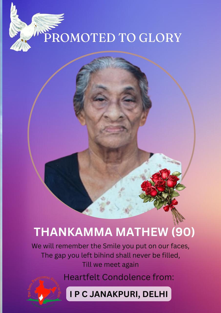 ഐപിസി ഡൽഹി സ്റ്റേറ്റ് ജനക്പുരി സഭയുടെ മെമ്പറും, ഐപിസി ജനറൽ കൗൺസിൽ അംഗവുമായ ബ്രദർ. E. M. ഷാജിയുടെ മാതാവ് ശ്രീമതി തങ്കമ്മ മാത്യു(90) (W/O. Late. മുണ്ടക്കയം ഈട്ടിക്കൽ E. K. മാത്യു) 20/2/2026 ന് ഡൽഹിയിൽ B-197, Chattarpur Enclave, Phase II കർത്തൃ സന്നിധിയിൽ ചേർക്കപ്പെട്ടു.