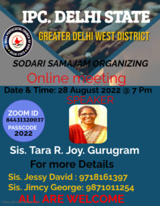 ഐപിസി ഡൽഹി സ്റ്റേറ്റ് ഗ്രേറ്റർ ഡൽഹി വെസ്റ്റ് ഡിസ്ട്രിക്ട് സോദരി സമാജം ഒരുക്കുന്ന ഓൺലൈൻ മീറ്റിംഗ് 2022 ഓഗസ്റ്റ് 28 ന് വൈകിട്ട് 7 മണി മുതൽ സൂം പ്ലാറ്റ് ഫോമിൽ നടത്തപ്പെടും.