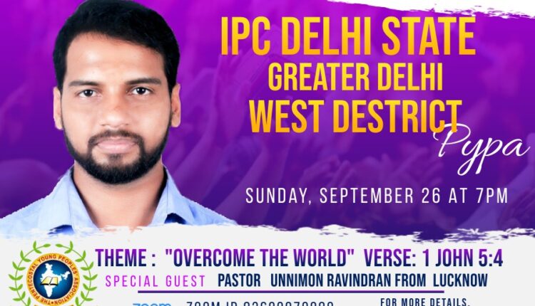आई.पी.सी दिल्ली स्टेट ग्रेटर दिल्ली वेस्ट डिस्ट्रिक्ट पी.वाई.पी.ए द्वारा आयोजित एक दिवसीय ऑनलाइन बैठक रविवार 26 सितंबर 2021 को शाम 7 बजे से होगी। संसार पर विजय 1 यूहन्ना 5:4 विषय है।पादरी उन्नीमोन रवींद्रन (लखनऊ) मुख्य अतिथि होंगे।