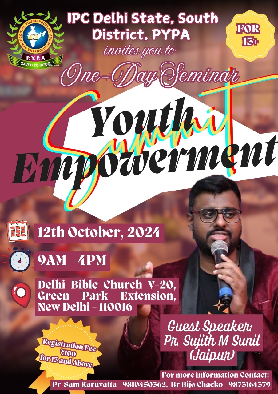 ഐപിസി ഡൽഹി സ്റ്റേറ്റ് സൗത്ത് ഡിസ്ട്രിക്ട് PYPA യുടെ ആഭിമുഖ്യത്തിൽ 2024 ഒക്ടോബർ 12 ന് രാവിലെ 9 മണി മുതൽ വയ്കുന്നേരം 4 മണി വരെ ഡല്ഹി ബൈബിൾ ചർച്ച് വി 20, ഗ്രീൻപാർക്കിൽ വച്ച് ഏക ദിന സെമിനാർ നടക്കുന്നതാണ്. യുവ പ്രഭാഷകൻ പാസ്റ്റർ. സുജിത്. എം. സുനിൽ (ജയ്പൂർ) മുഖ്യ പ്രഭാഷകൻ ആയിരിക്കും.